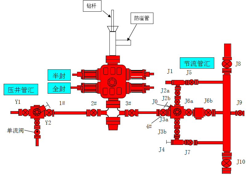 為了進(jìn)一步加強(qiáng)和規(guī)范井控裝置現(xiàn)場試壓工作,長慶油田烏審旗監(jiān)督部對目前鉆井工程二開前井控裝置試壓作業(yè)中,普遍只對防噴器、節(jié)流壓井管匯、放噴管線分別進(jìn)行整體試壓,未按照井控細(xì)則第三十二條第二條的規(guī)定對閥門進(jìn)行逐一試壓。為切實(shí)將強(qiáng)和規(guī)范井控裝置現(xiàn)場試壓工作,嚴(yán)格落實(shí)井控設(shè)備逐一試壓要求,提高試壓效率,現(xiàn)將所有閥門與放噴器組合試壓進(jìn)行優(yōu)化,分為11組逐一試壓(閥門編號附圖,T字號為側(cè)導(dǎo)流管閥件)