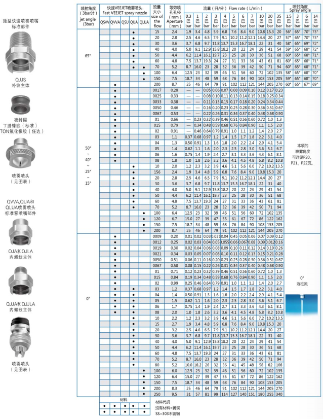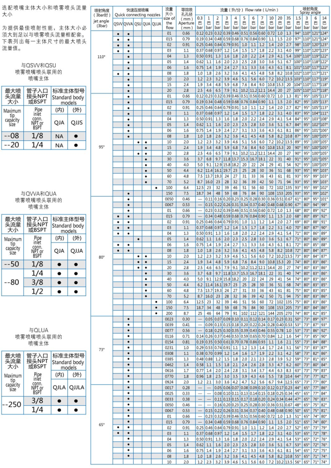 QVVVA series fast fan nozzles provide flow rates lower than 3.9l/min at 3bar. QUA and QLUA series nozzles provide flow rates of 3.9l/min or greater at 3bar pressure.